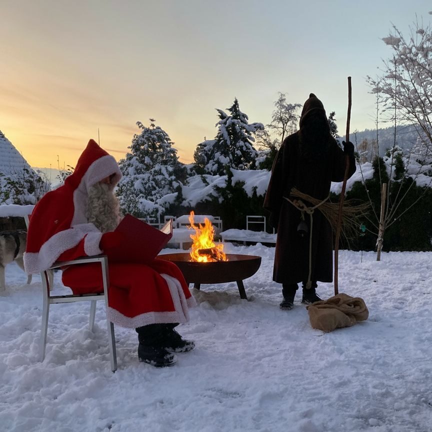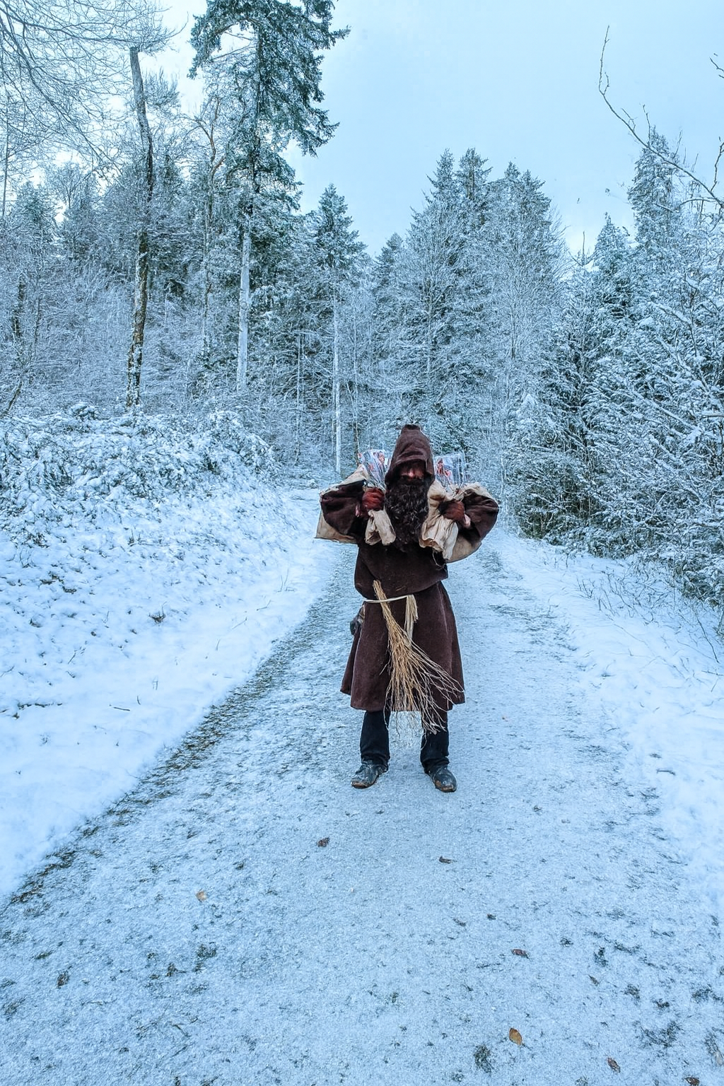 Der Chlaus ist ein fröhlicher, bärtiger Mann, der im Wald lebt und Kinder mit Geschenken und Leckereien überrascht. Er bringt Freude und erzählt Geschichten aus der Natur, während er die Kinder ermutigt, brav und freundlich zu sein.